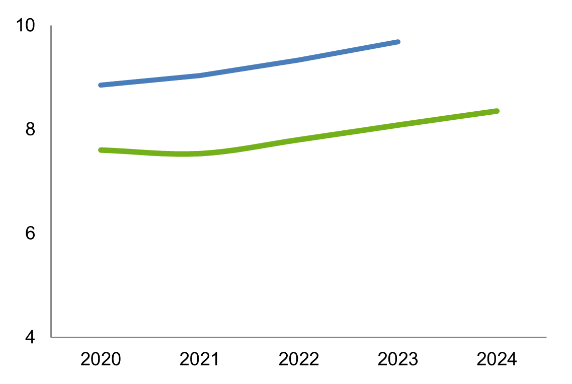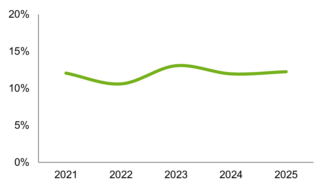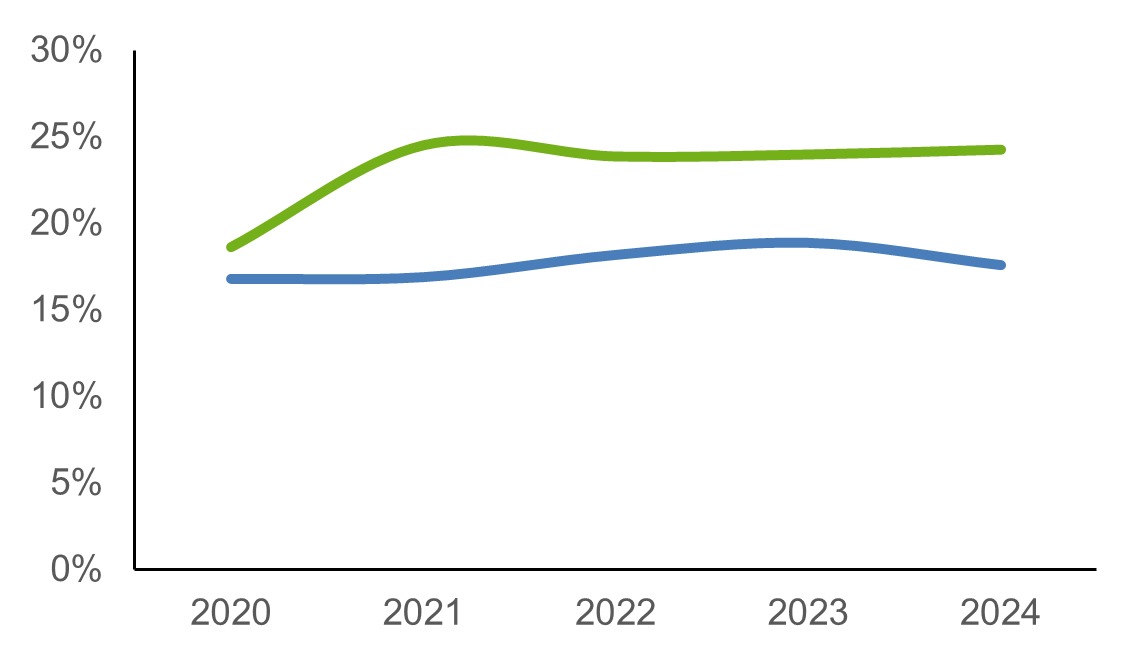 Er wordt nauwelijks tot geen externe inhuur geraamd. Er worden in de begroting namelijk loonkosten geraamd. Daarom worden bij deze indicator de werkelijk gerealiseerde inhuurpercentages tot en met 2024 weergegeven.