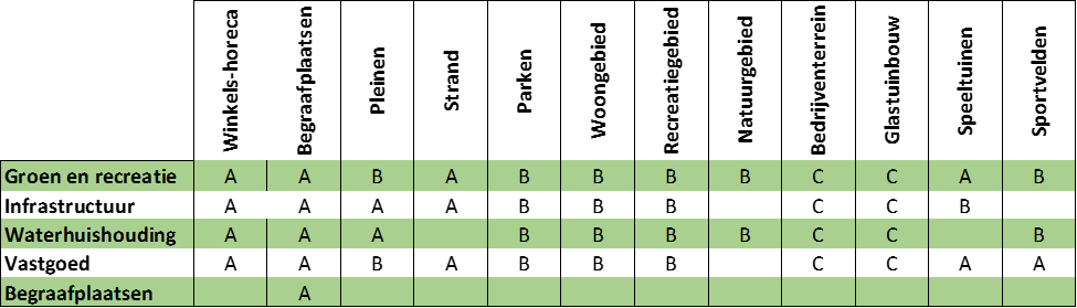We hanteren bij de zorg voor de kapitaalgoederen een minimumkwaliteitsniveau dat voldoet aan de CROW-norm ‘C’. Met de gemeenteraad zijn de gewenste (beeld) kwaliteitsniveaus bepaald (zie tabel). Voor een aantal functiegebieden zijn hogere kwaliteitsniveaus vastgesteld, omdat deze beter aansluiten bij onze aandachtspunten en kernwaarden. De gehanteerde kwaliteitsniveaus zijn: goed (A), voldoende (B) en matig (C).